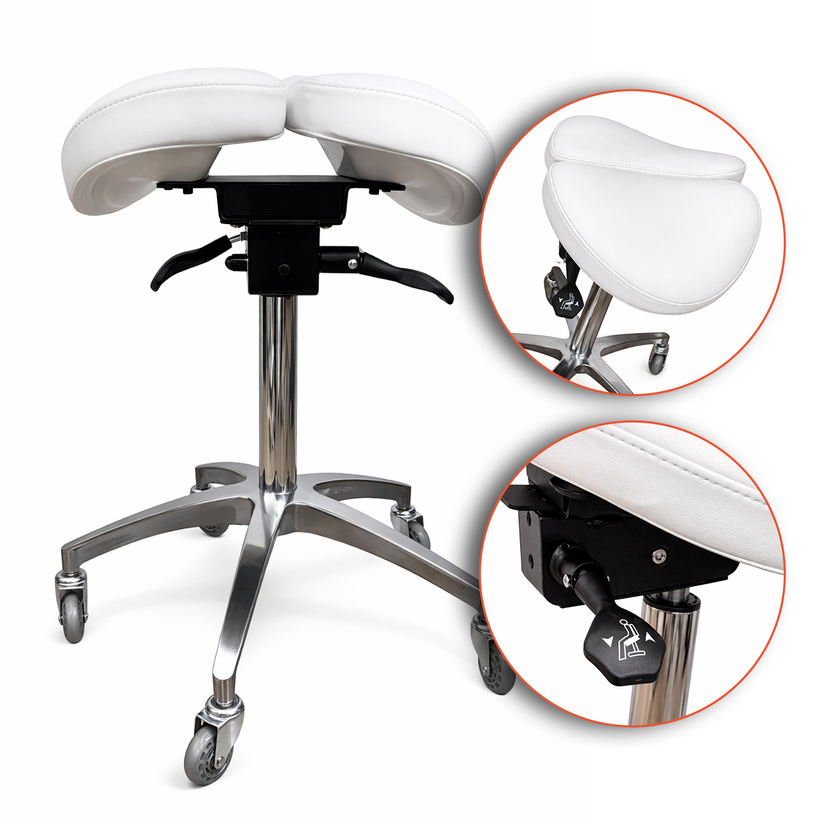 O design em formato sela bipartido proporciona postura mais natural ao usuário, ajudando a reduzir tensões e melhorar o conforto durante longos períodos de trabalho.